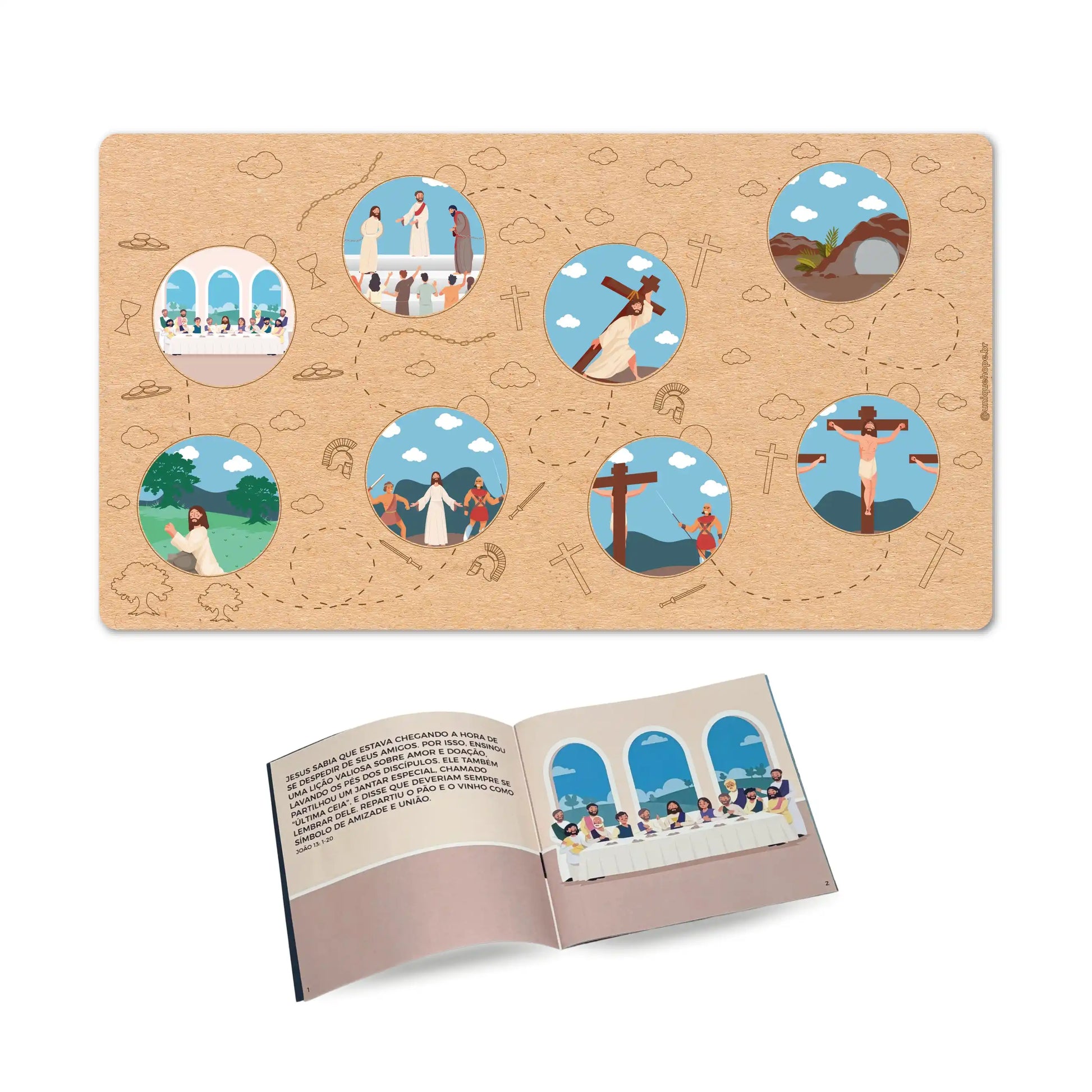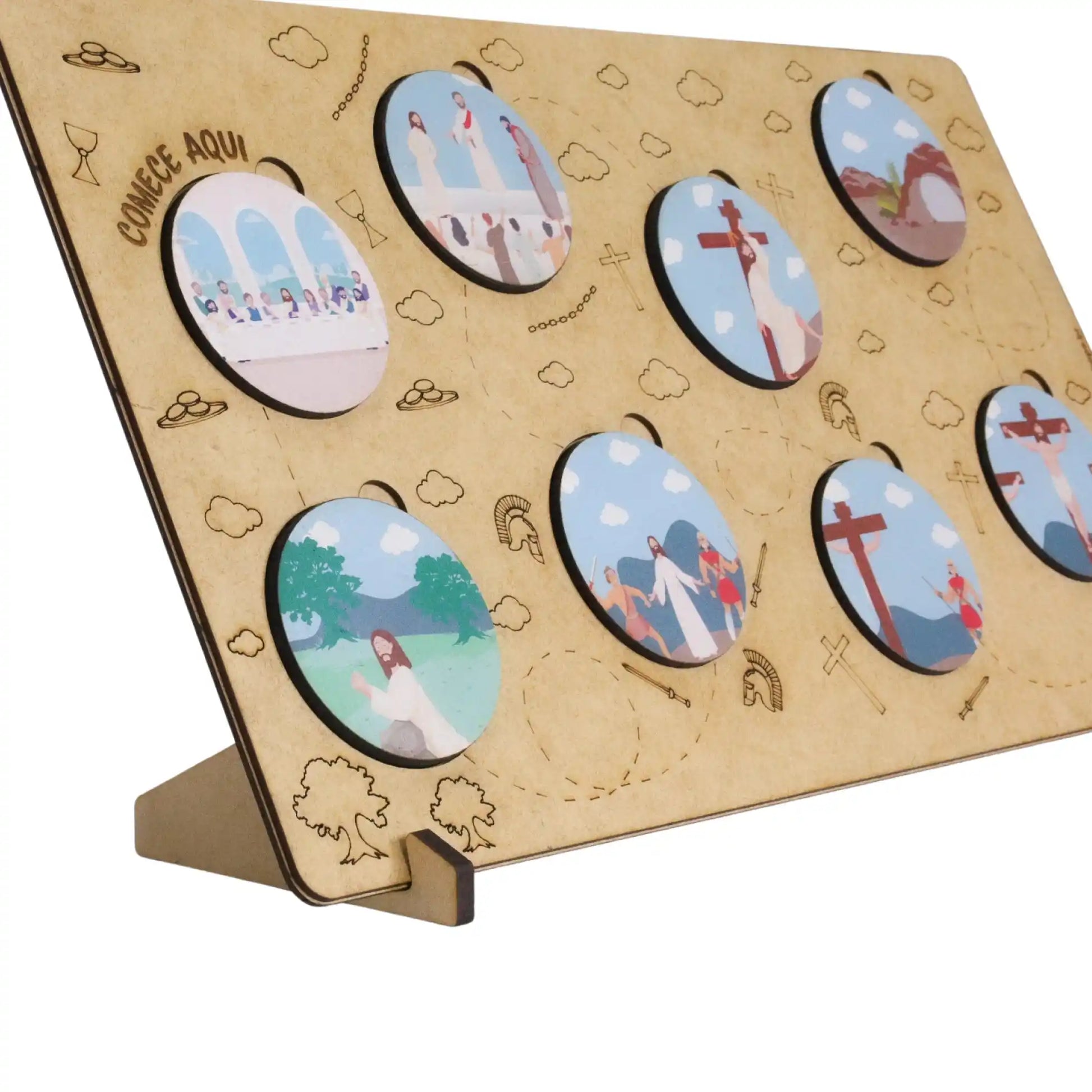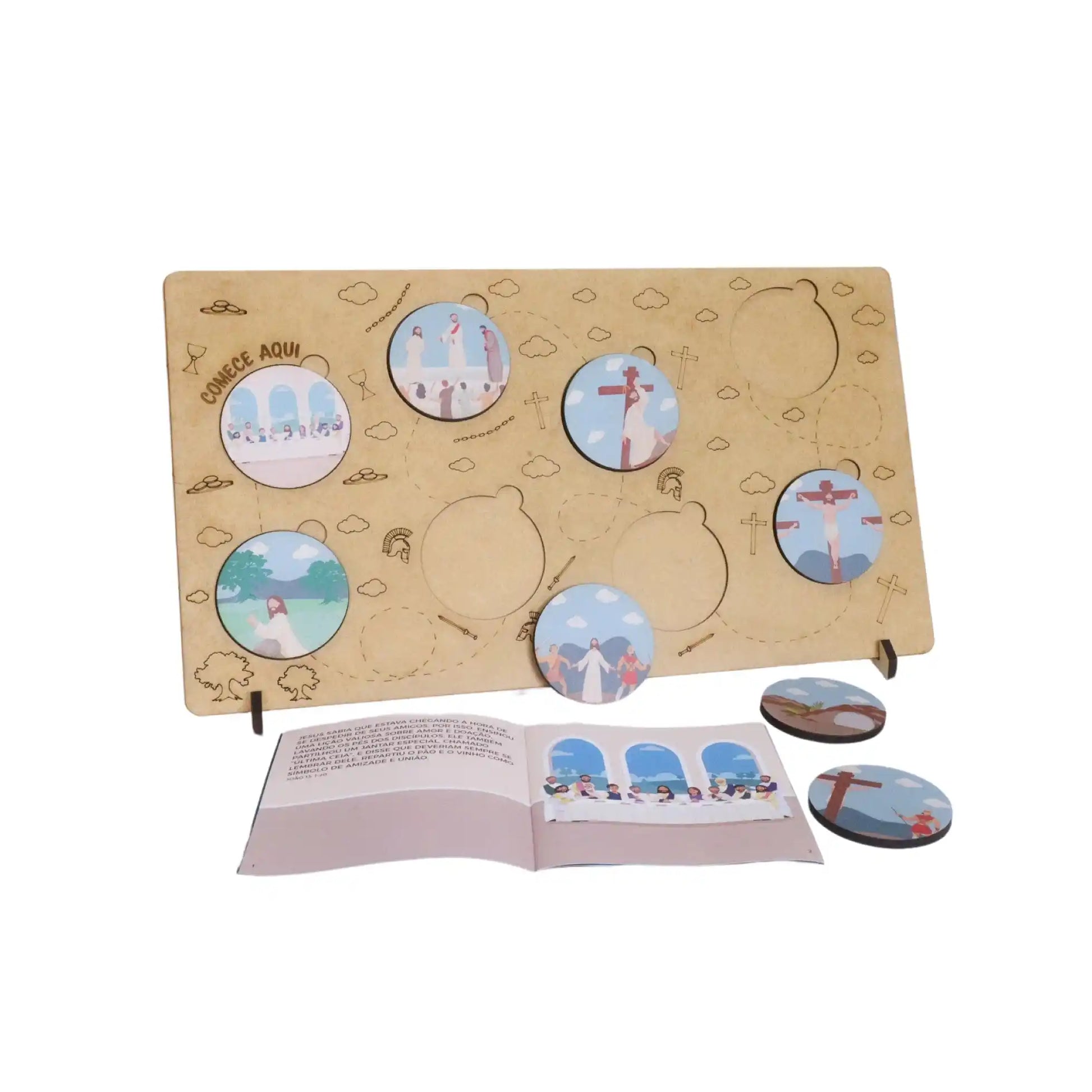 Acompanha: Base + 8 peças para encaixe + livreto com a história da Crucificação de Jesus Cristo + suporte
