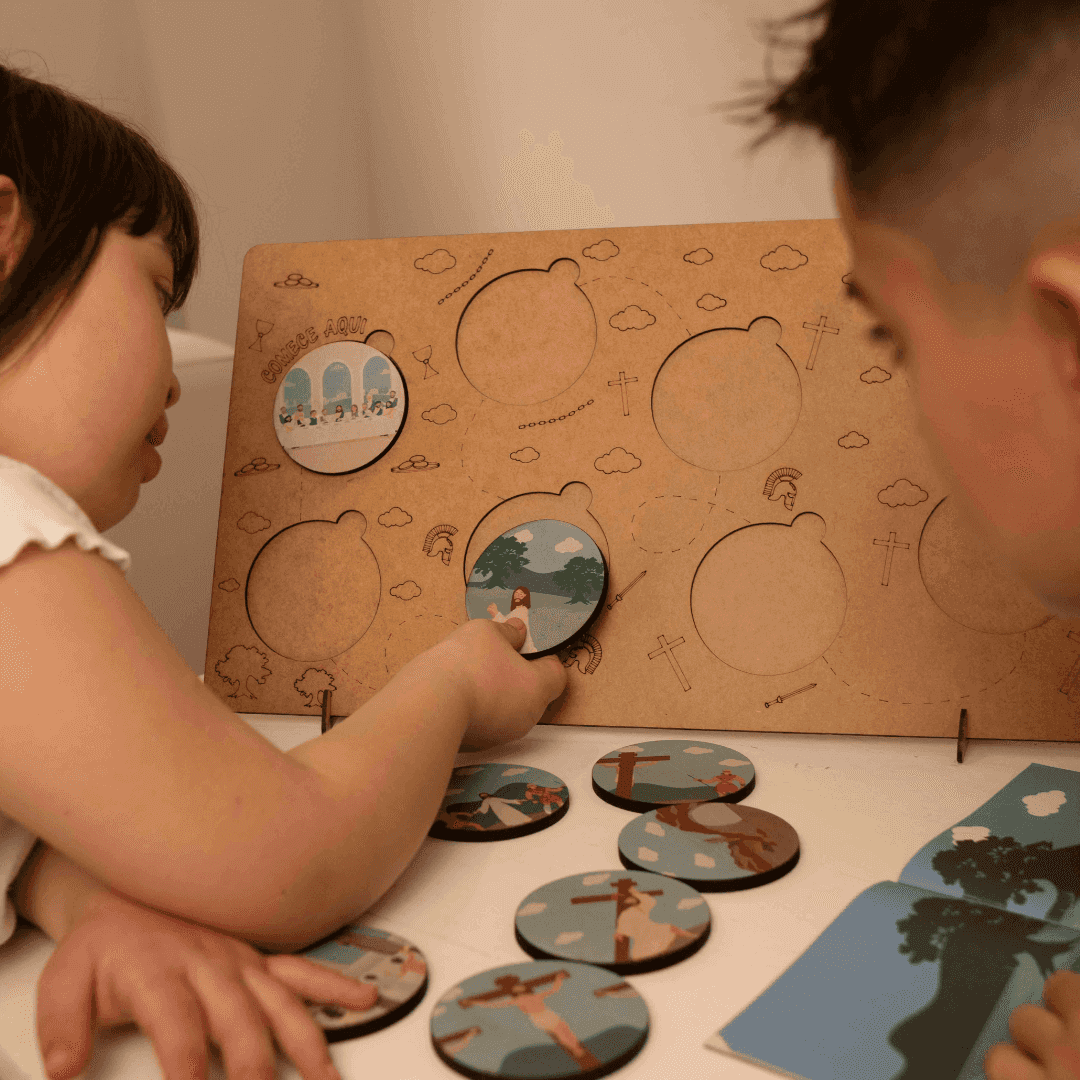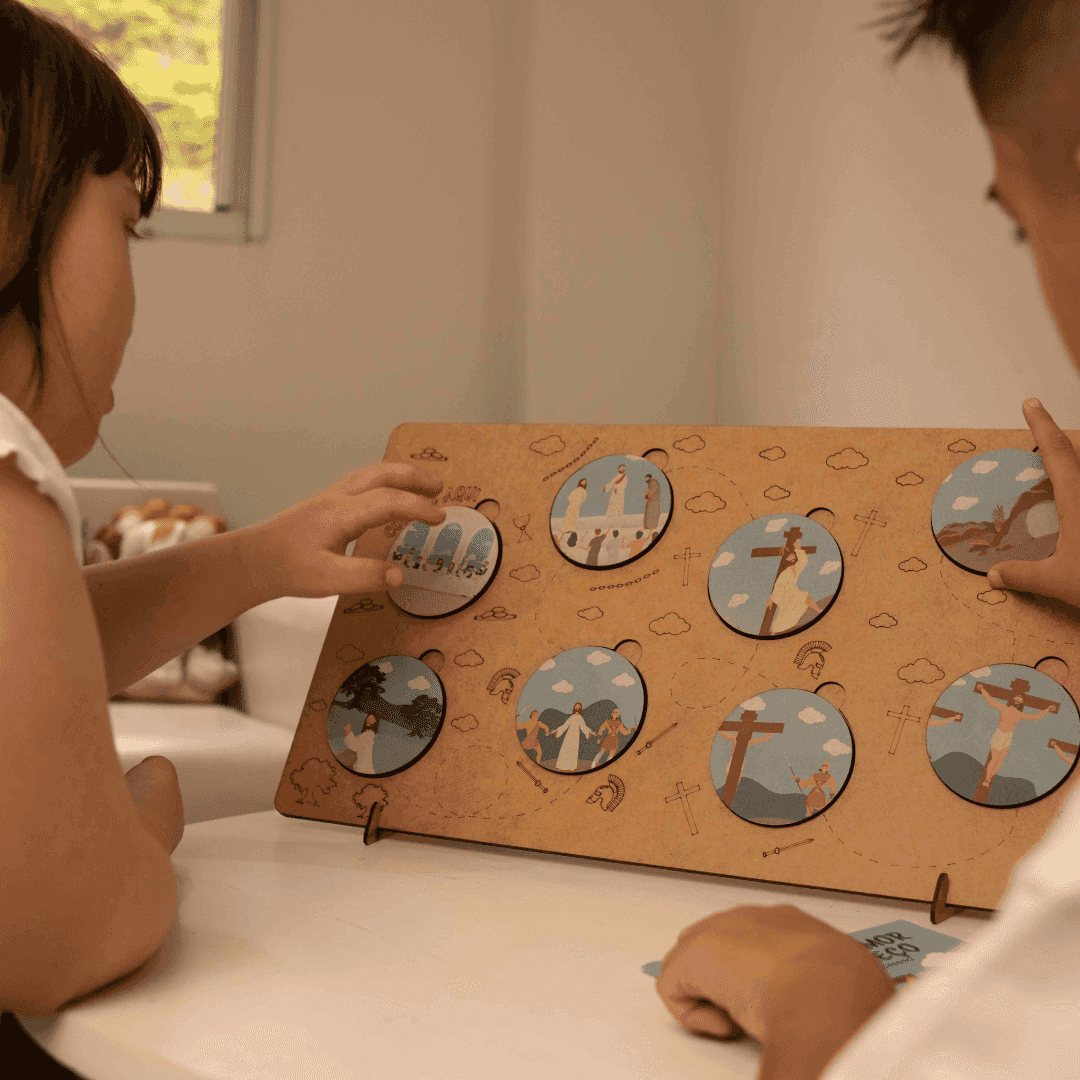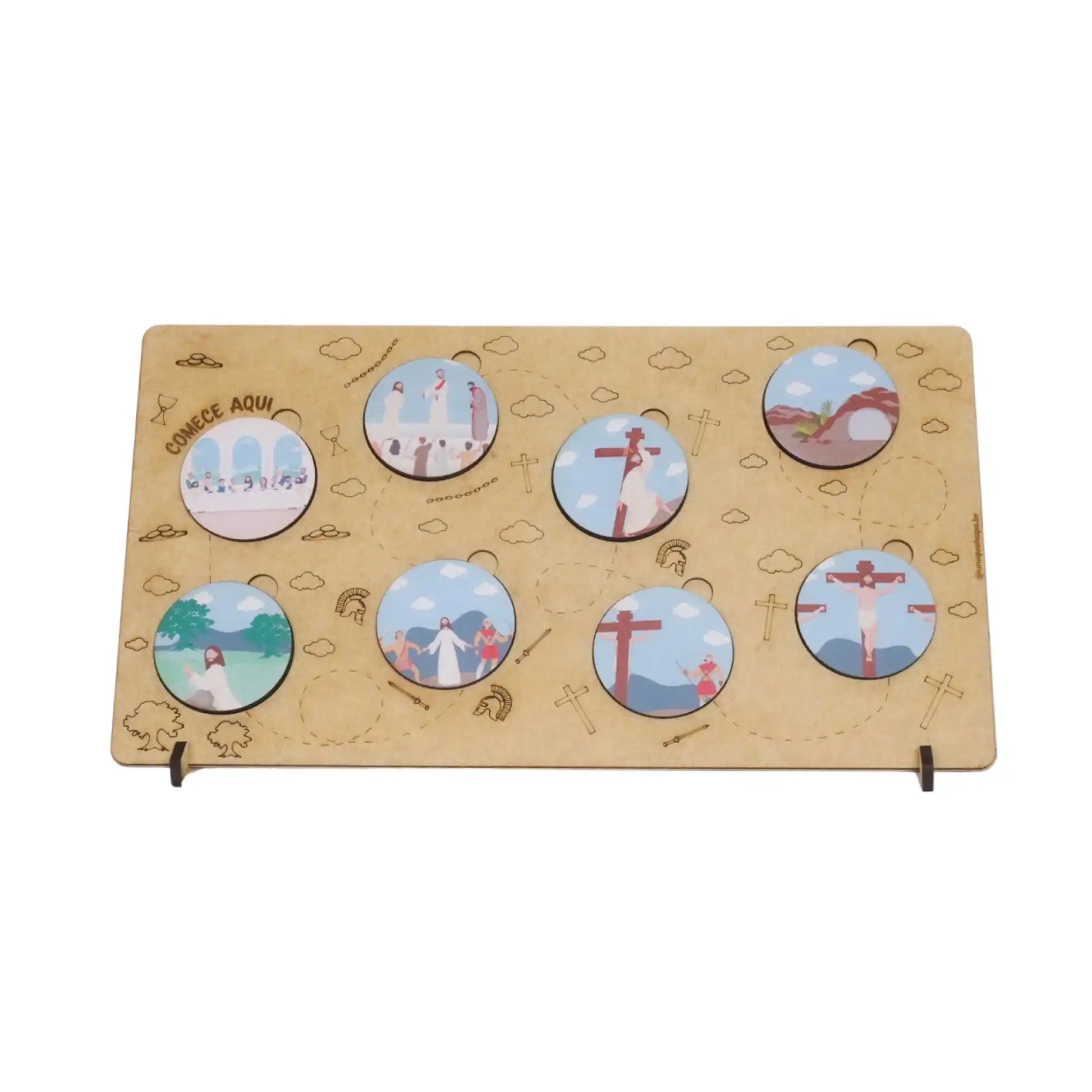 Acompanha: Base + 8 peças para encaixe + livreto com a história da Crucificação de Jesus Cristo + suporte