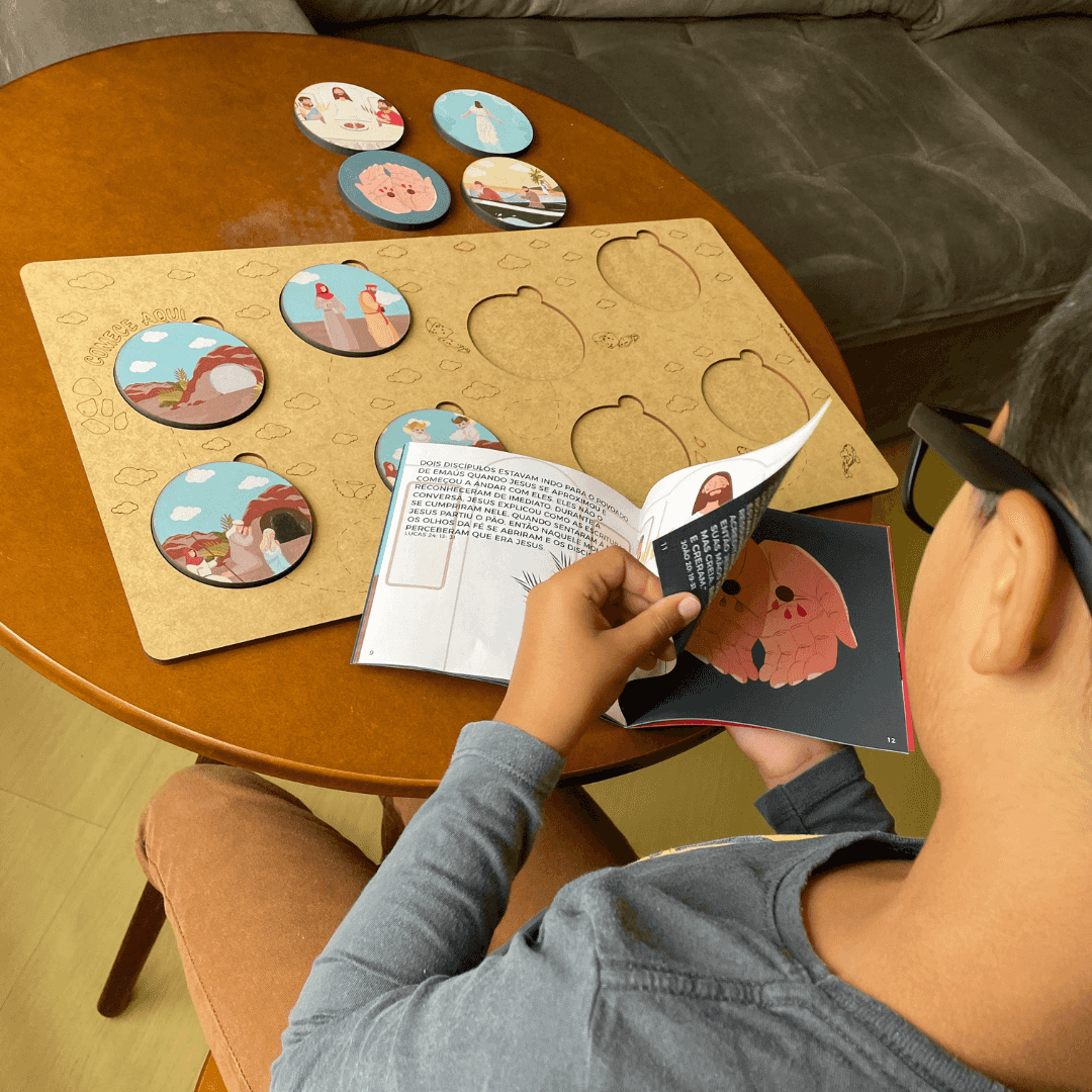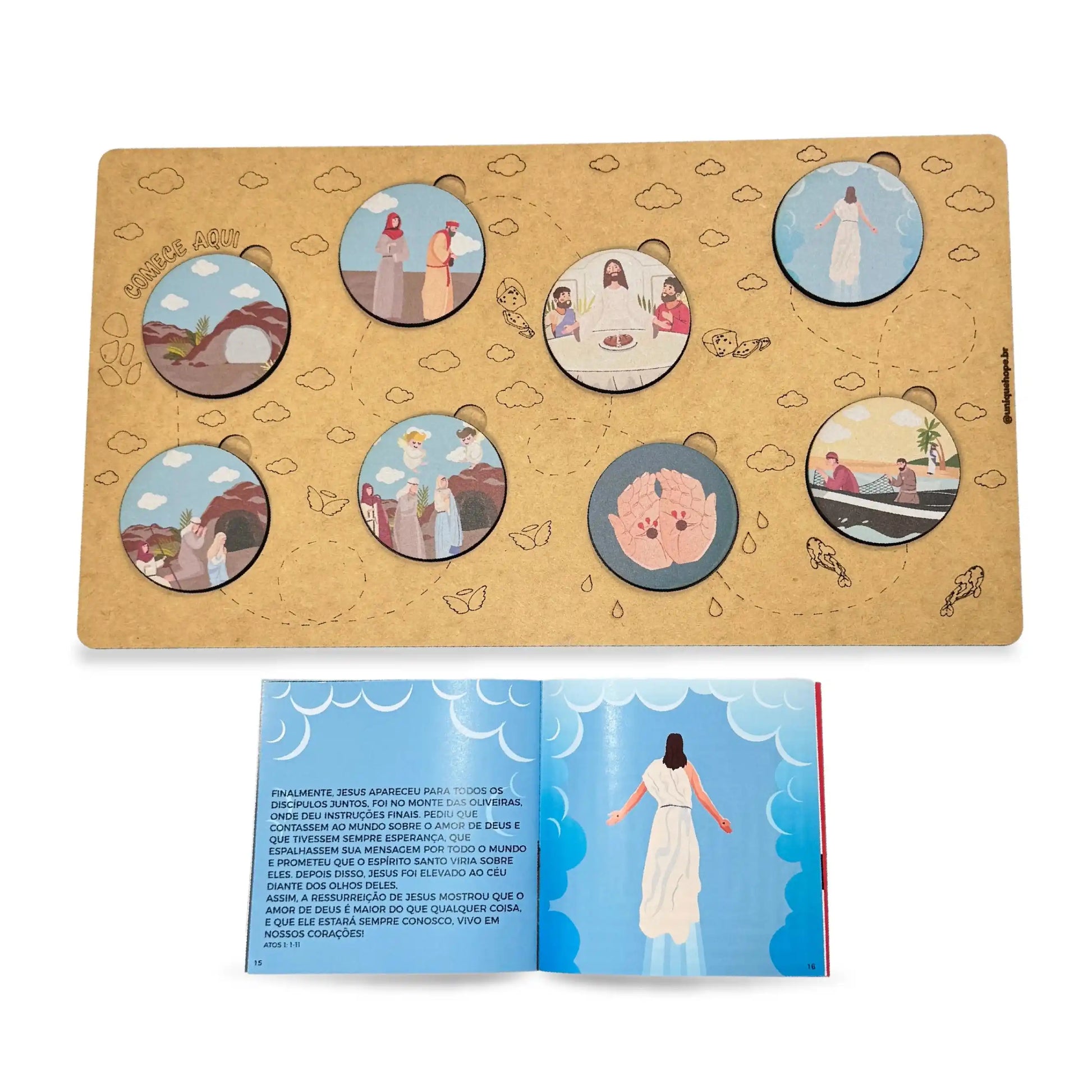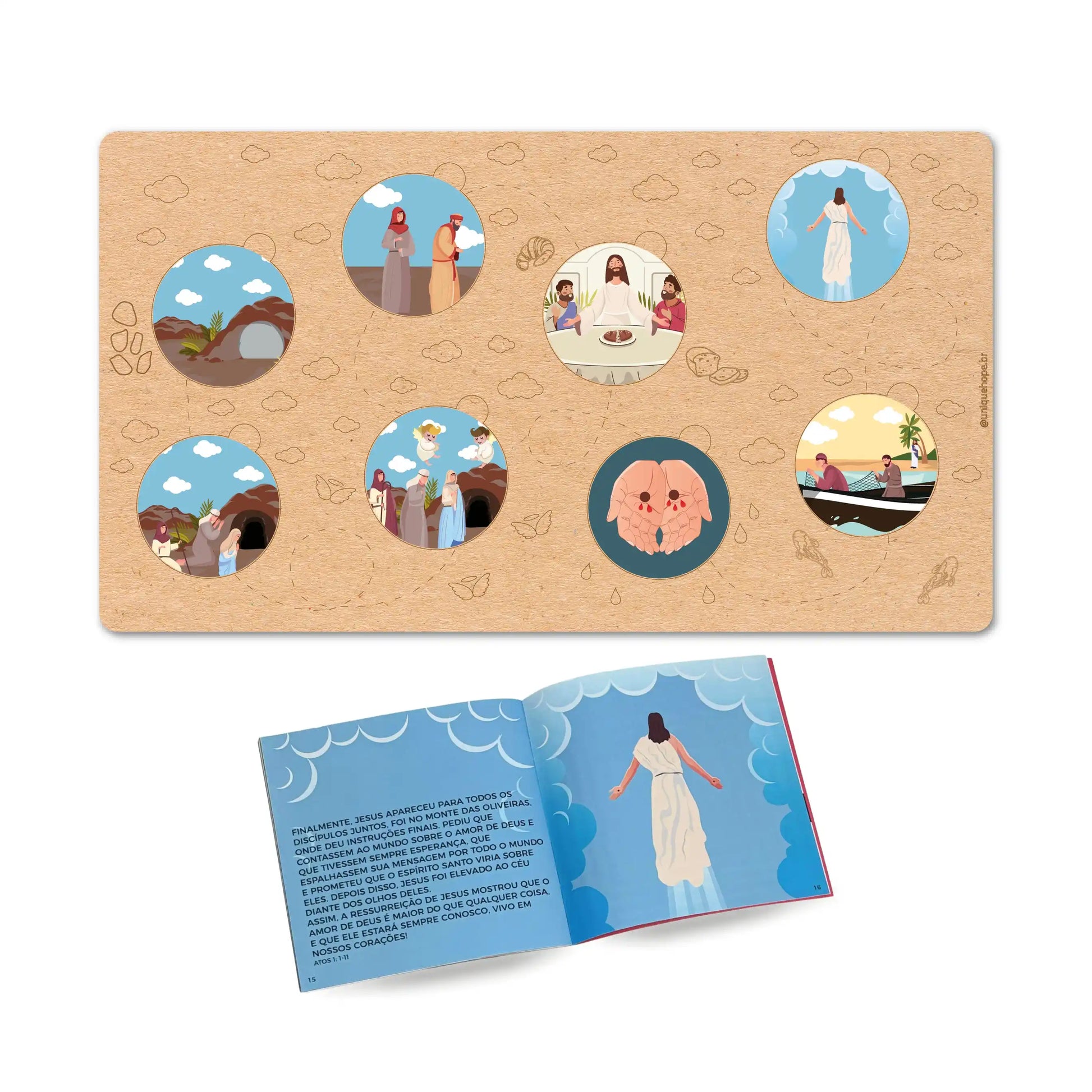 Acompanha: Base + 8 peças para encaixe + livreto com a história da Ressurreição de Jesus Cristo + suporte