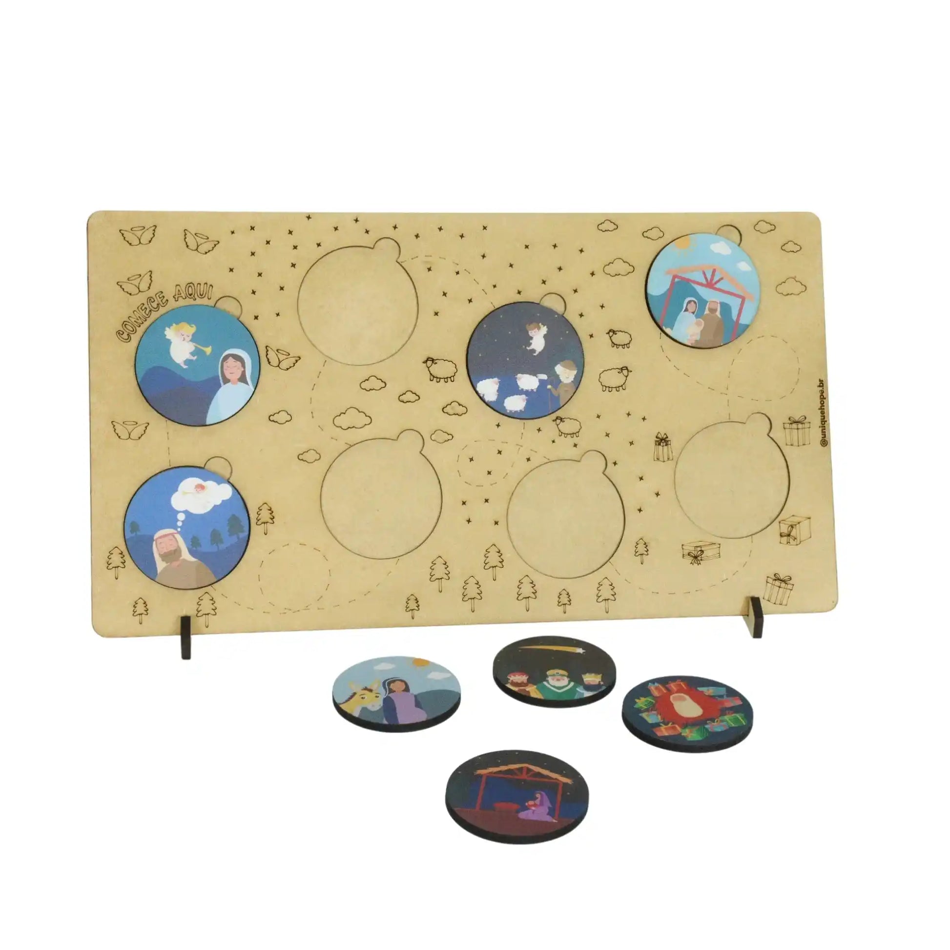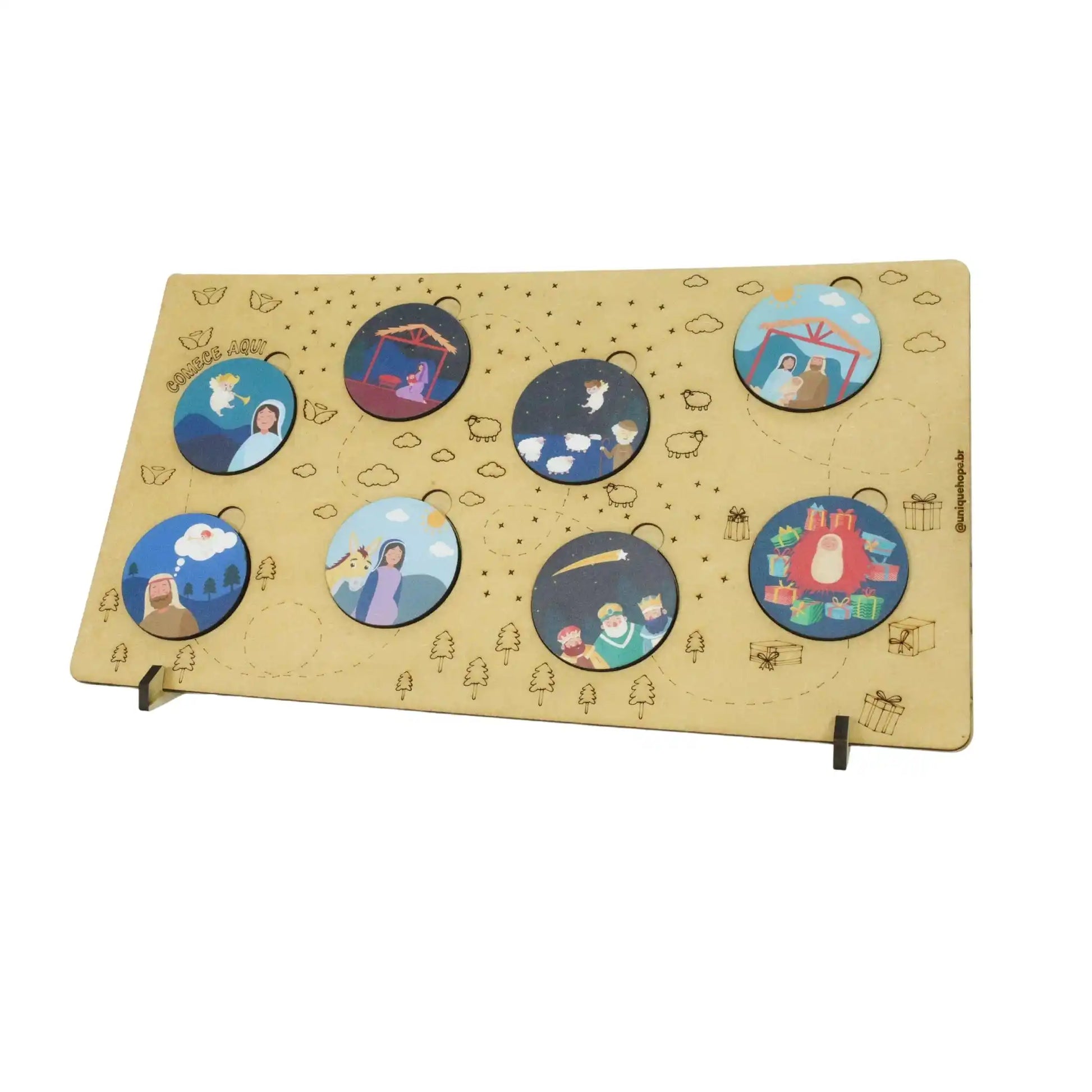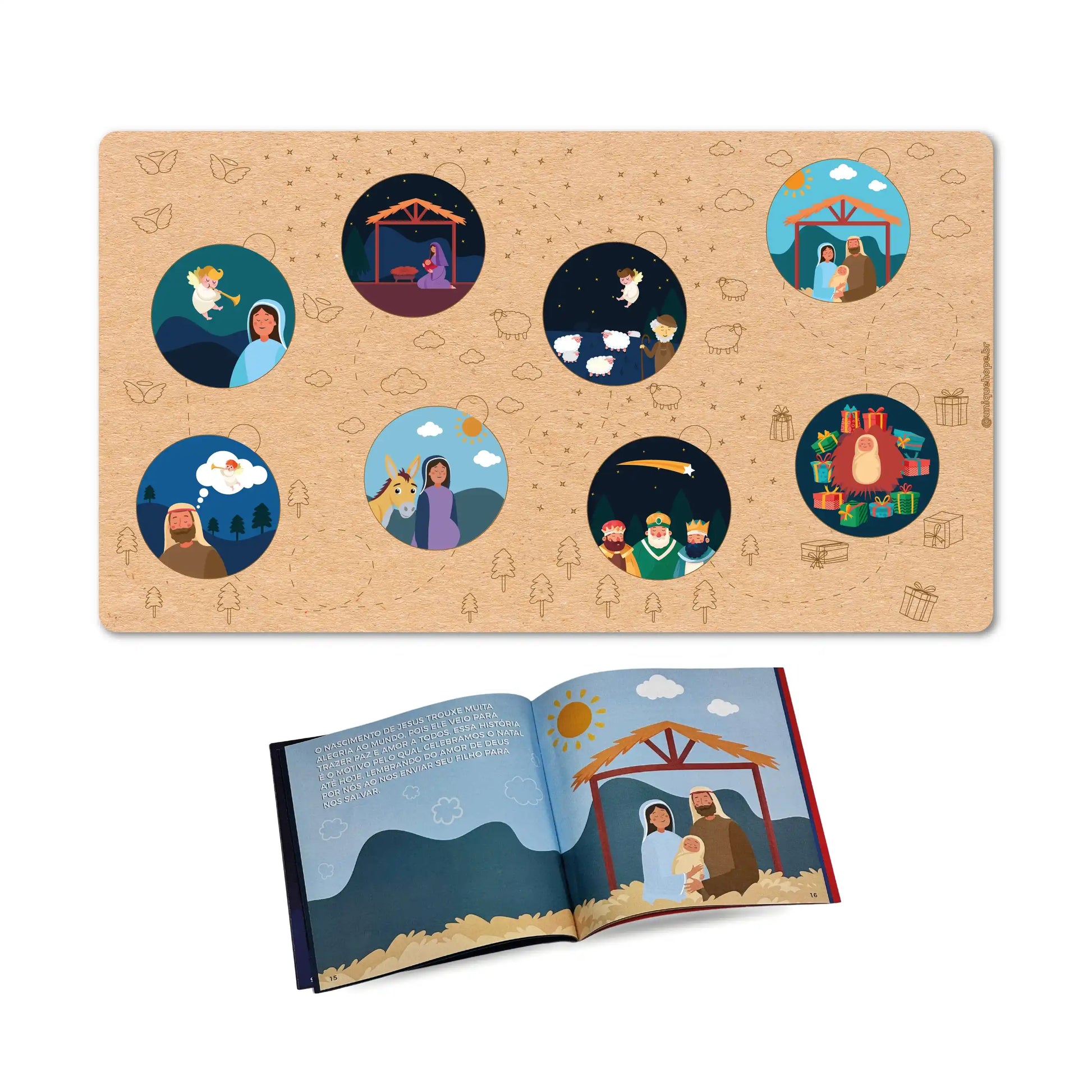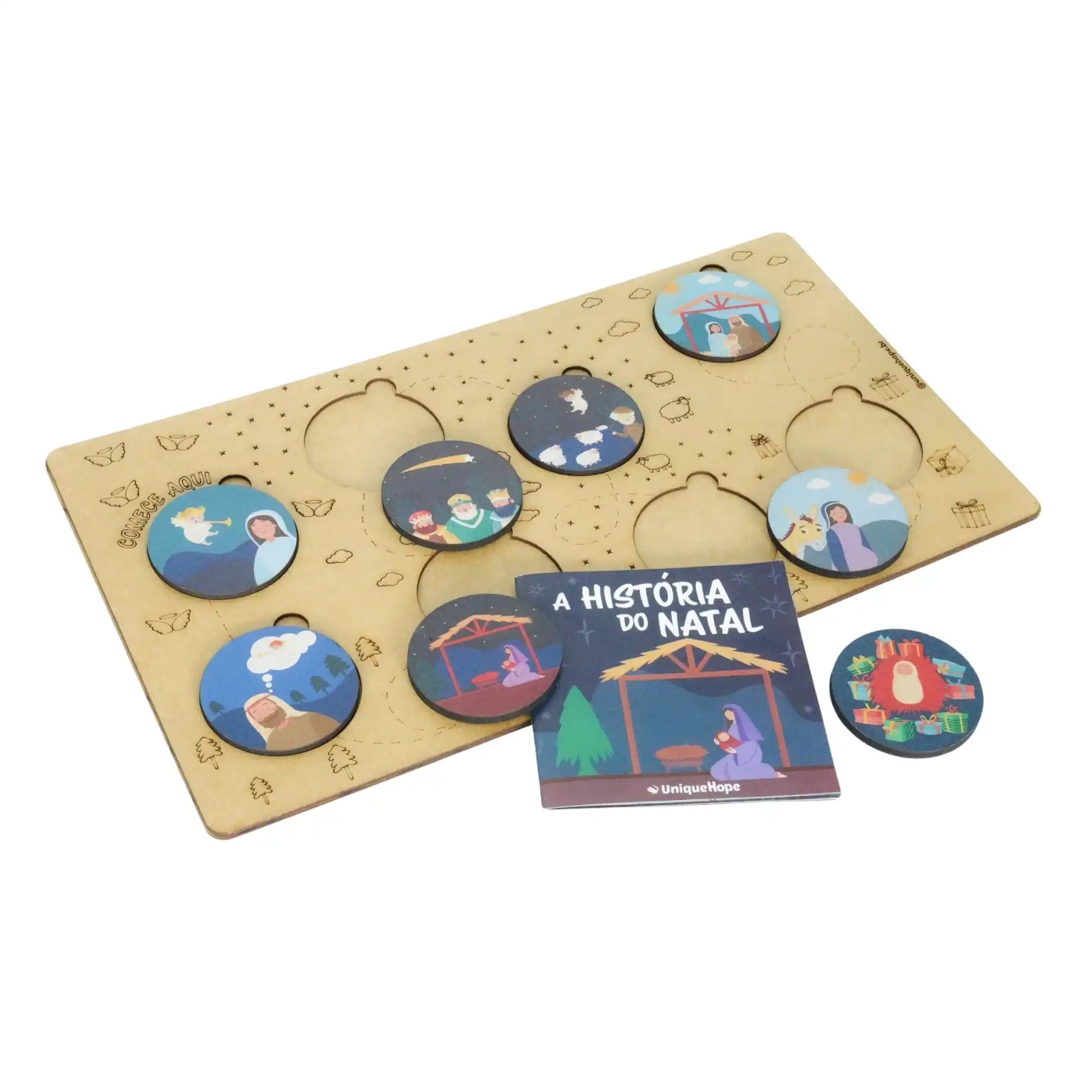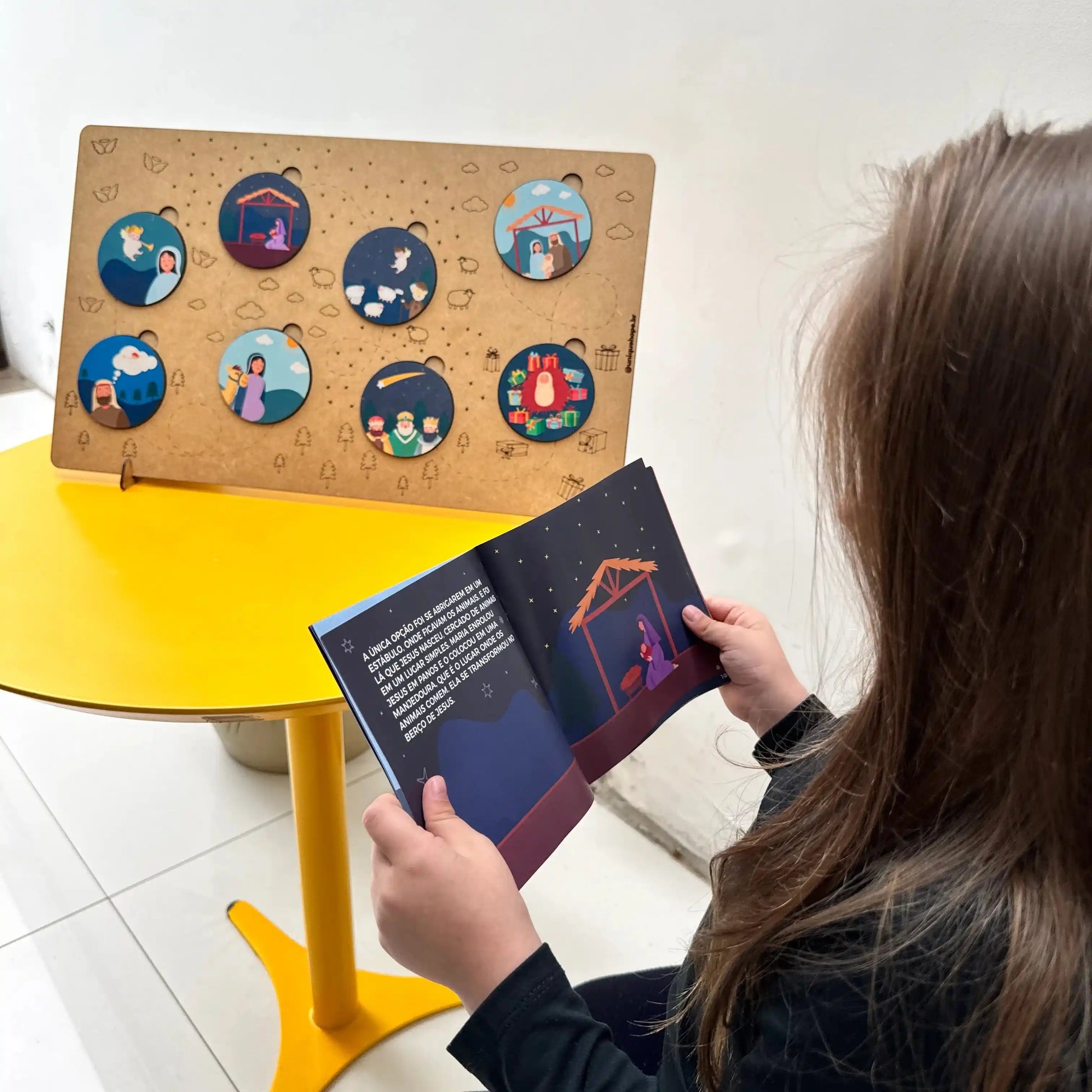 Acompanha: Base + 8 peças para encaixe + livreto com a história do Nascimento de Jesus Cristo + suporte