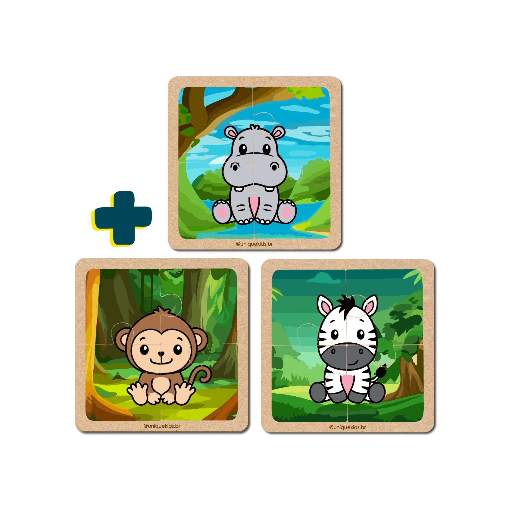 Combo Quebra-Cabeça 4 peças: 3 unidades (Hipopótamo, Macaco e Zebra)