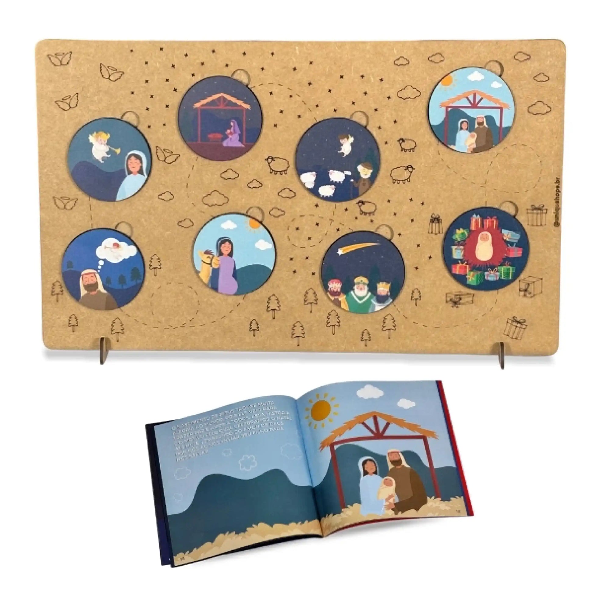 Jogo 01: Base + 8 peças para encaixe + livreto com a história do Nascimento de Jesus Cristo + suporte
