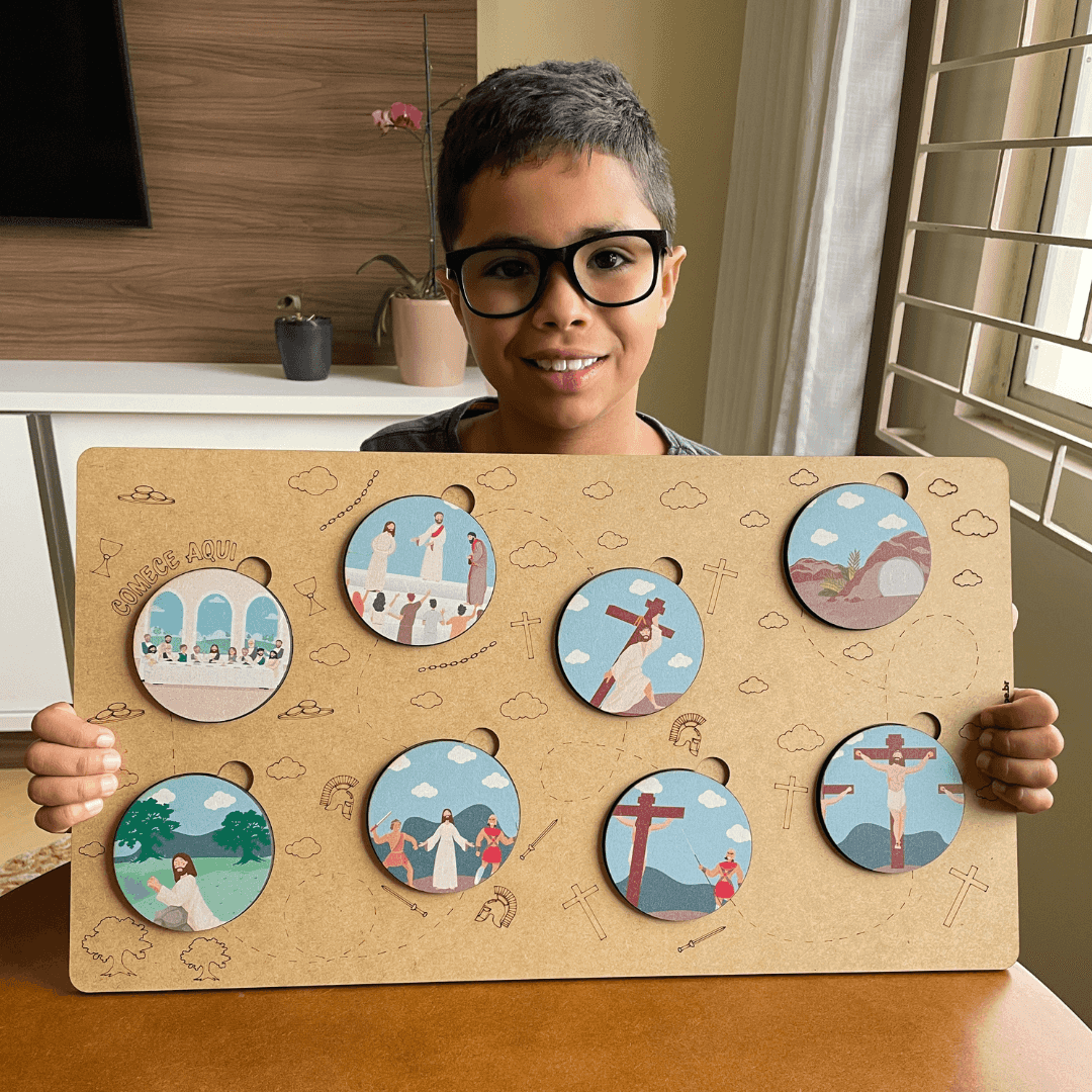 Jogo 02: Base + 8 peças para encaixe + livreto com a história da Crucificação de Jesus Cristo + suporte
