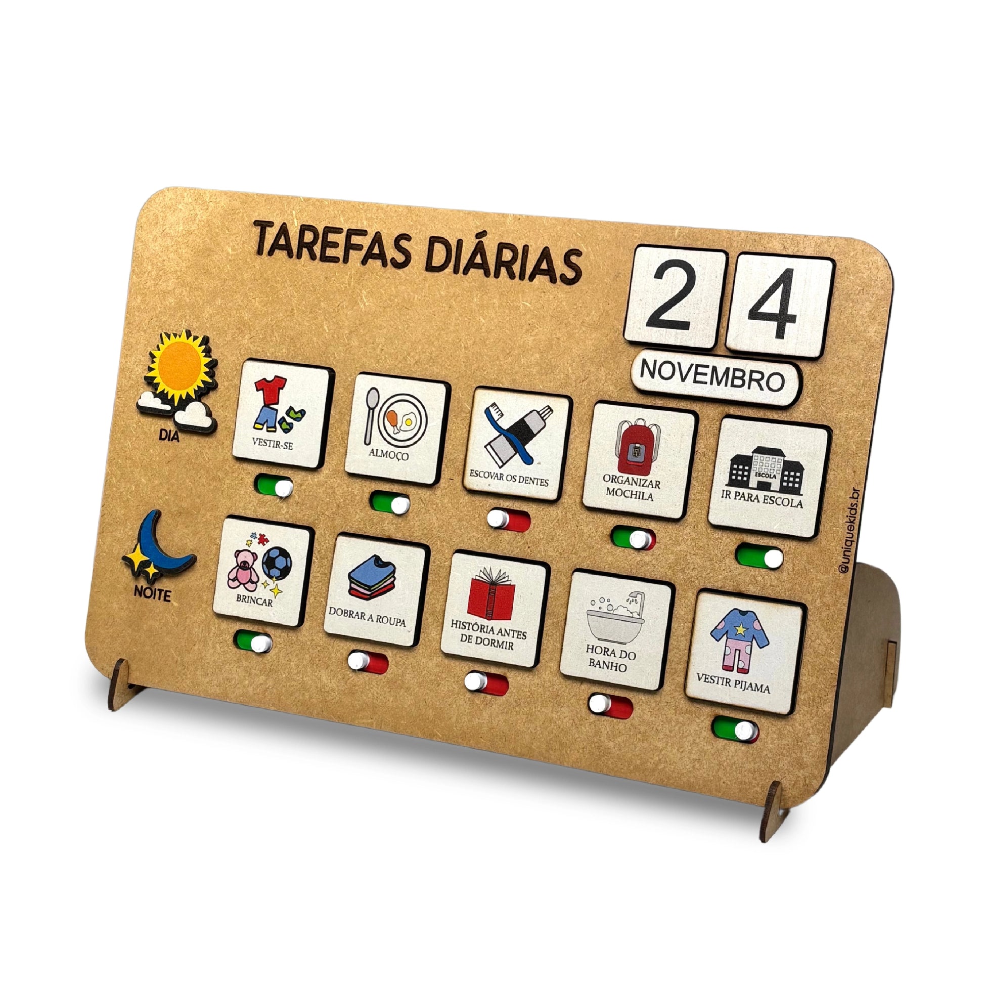 Acompanha: Quadro Tarefas Diárias com suporte e 31 cards pré-definidos + 3 cards em branco para personalizar como desejar, meses do ano e dias do mês. Quadro tem botão interativo para que a criança possa sinalizar o que já realizou.