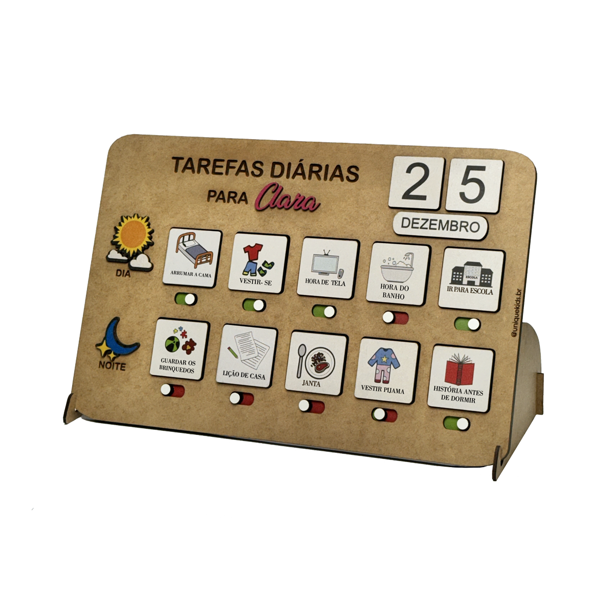 Acompanha: Quadro Tarefas Diárias com suporte e 31 cards pré-definidos + 3 cards em branco para personalizar como desejar, meses do ano e dias do mês. Quadro tem botão interativo para que a criança possa sinalizar o que já realizou.