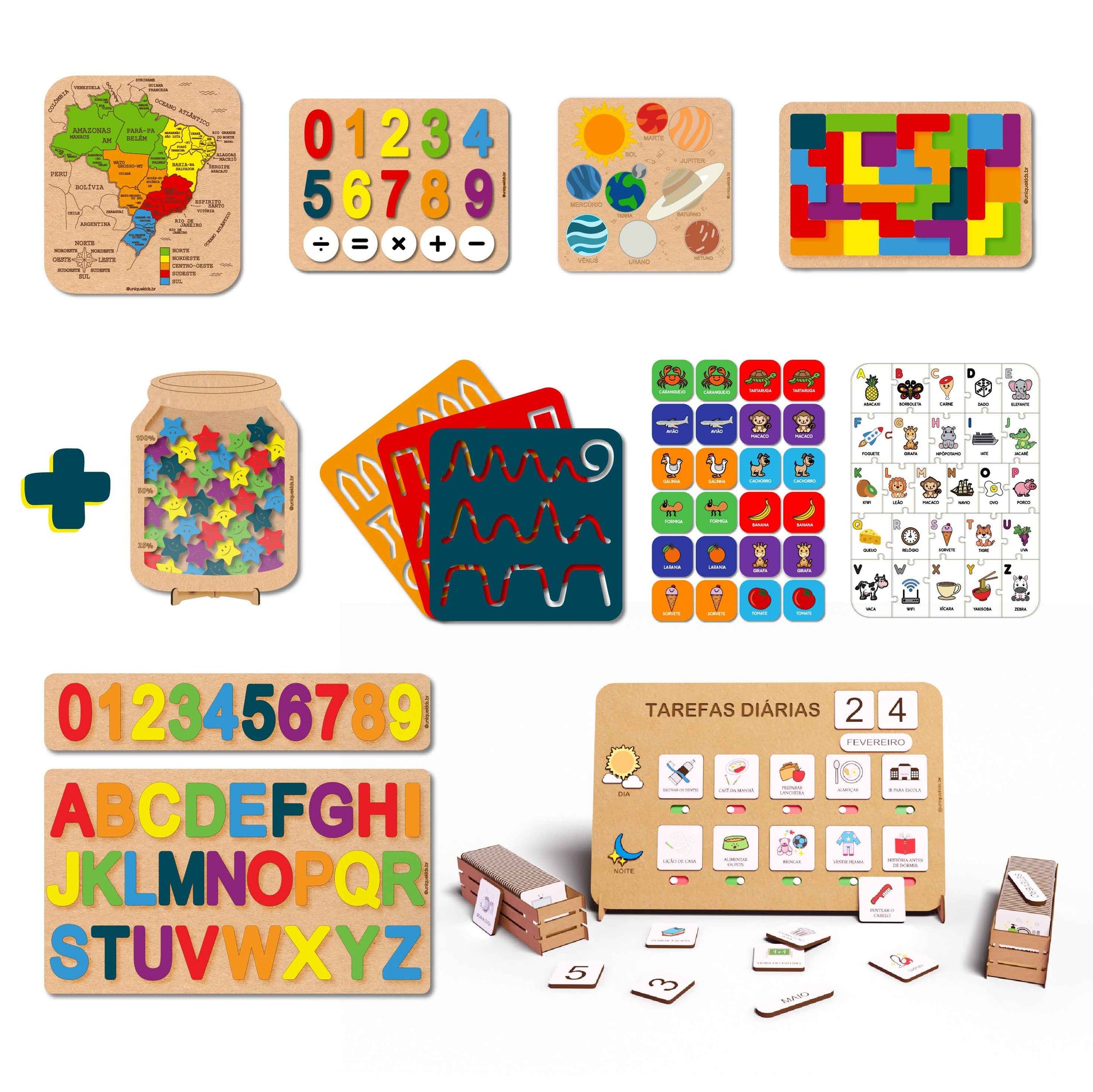 Acompanha: Quadro Tarefas Diárias com suporte e 31 cards pré-definidos + 3 cards em branco para personalizar como desejar, meses do ano e dias do mês. Quadro tem botão interativo para que a criança possa sinalizar o que já realizou.