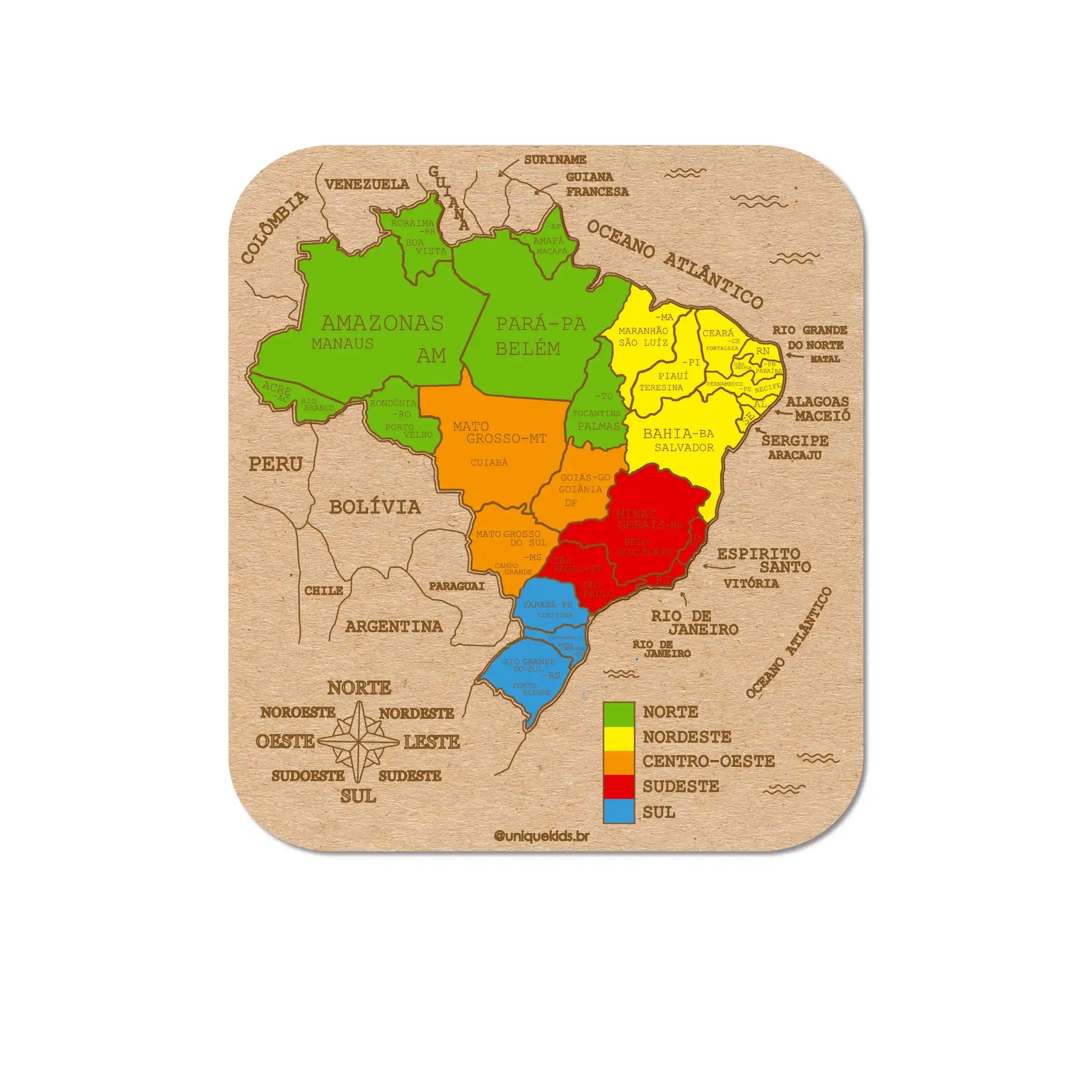 Acompanha: Jogo de encaixe mapa do Brasil separado por cores conforme as regiões. Contém a escrita dos estados e capitais.