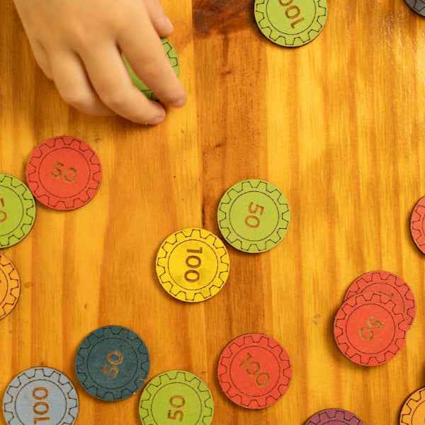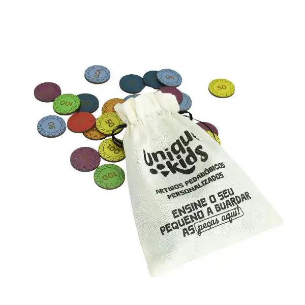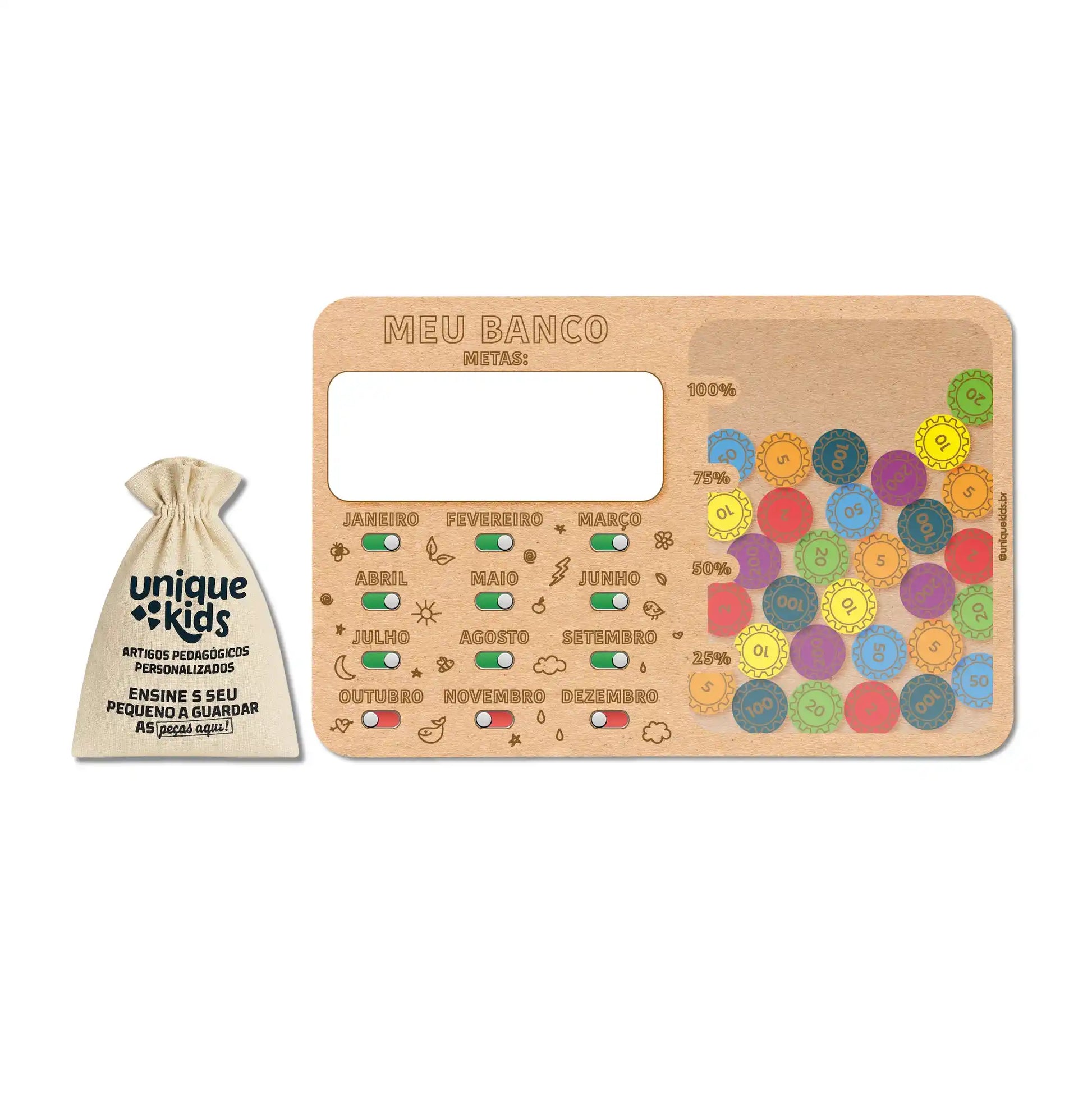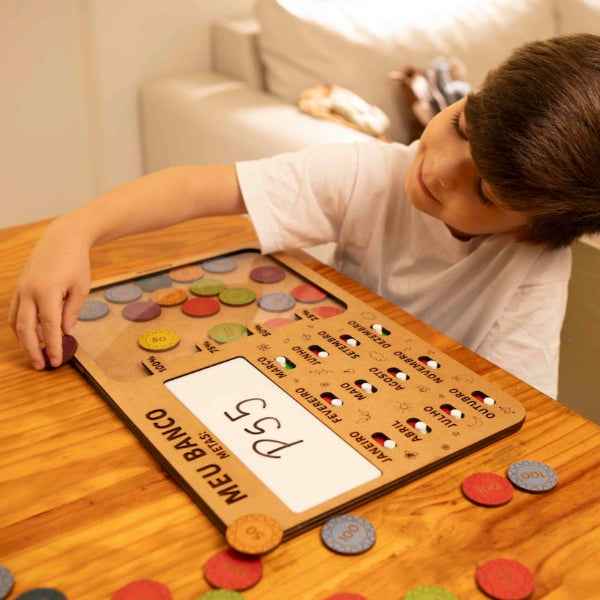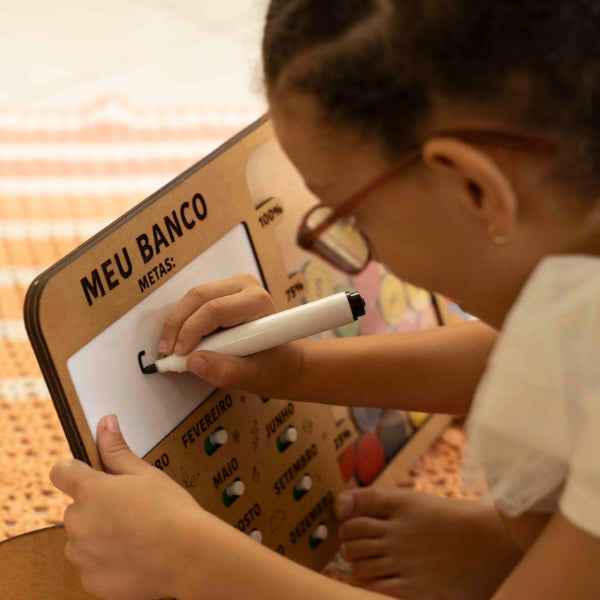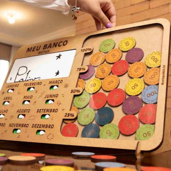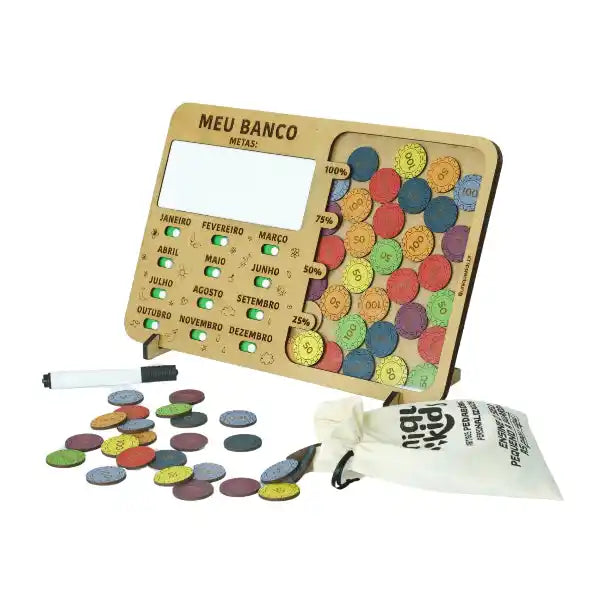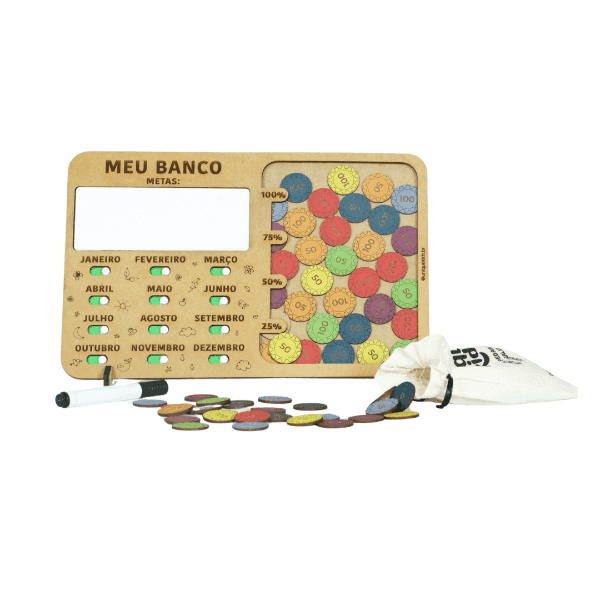 Acompanha: 1 banco em MDF de alta qualidade com botões interativos e espaço para escrever as metas e guardar as moedas, 35 moedas em MDF para simulação do dinheiro, 1 caneta e suporte.