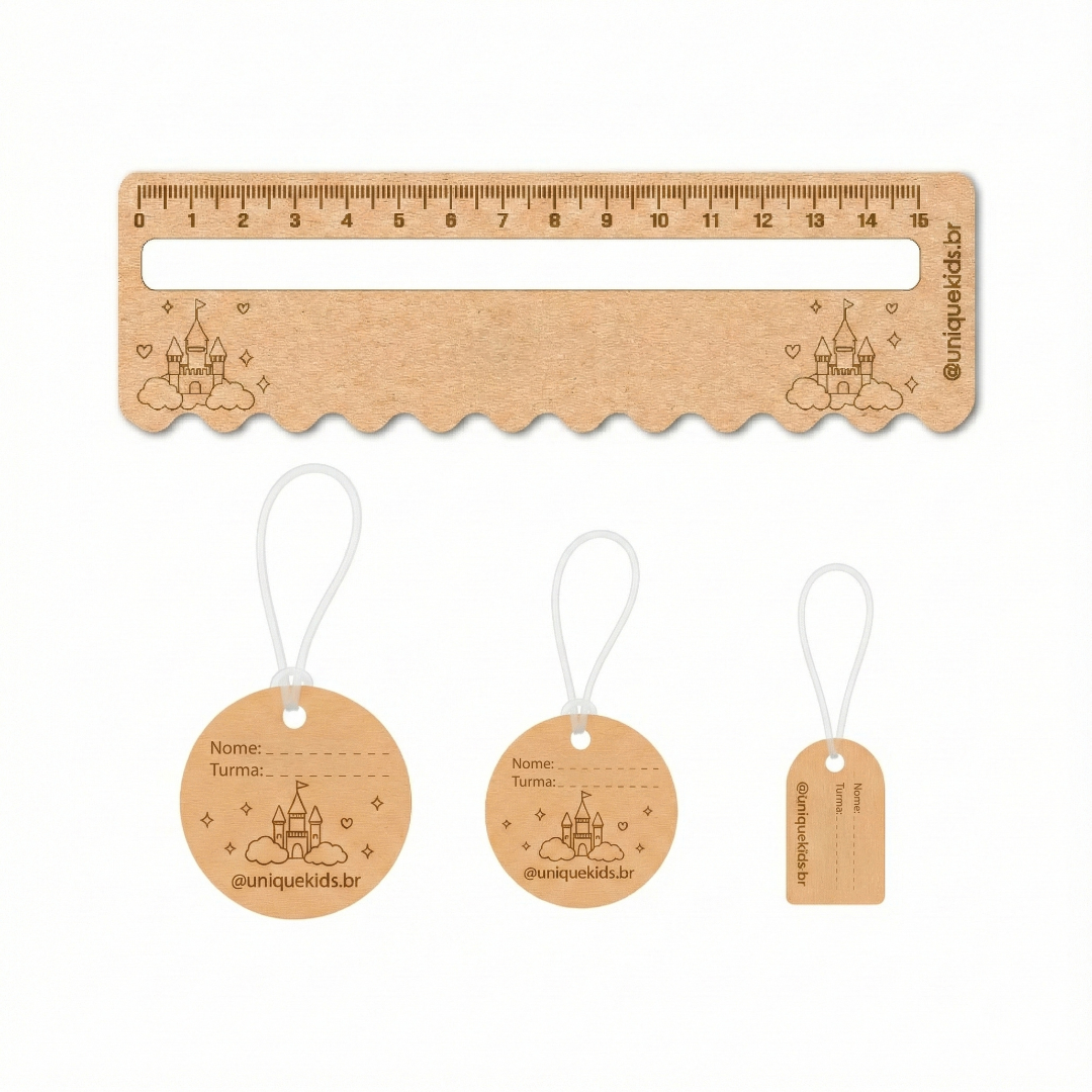 Um kit composto por tags para mochila e régua de leitura com o tema (futebol, castelo ou dinossauro). A régua é um excelente recurso para auxiliar no processo de escrita sendo um facilitador nesse momento. Feito em MDF de alta qualidade. A tag acompanha alça de silicone.