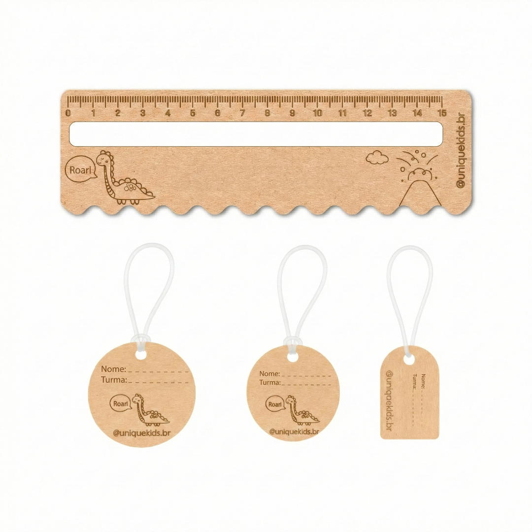 Um kit composto por tags para mochila e régua de leitura com o tema (futebol, castelo ou dinossauro). A régua é um excelente recurso para auxiliar no processo de escrita sendo um facilitador nesse momento. Feito em MDF de alta qualidade. A tag acompanha alça de silicone.